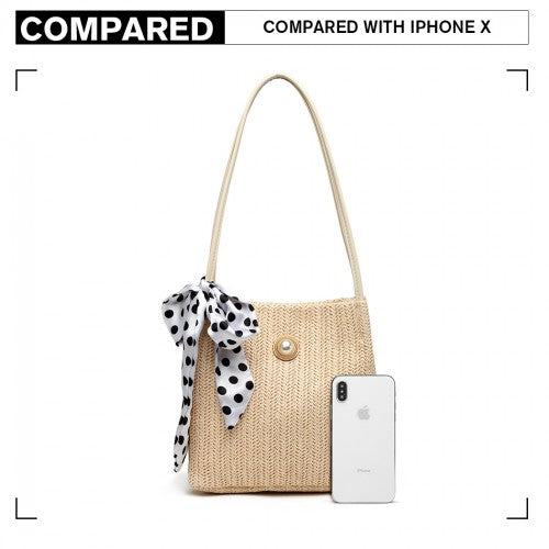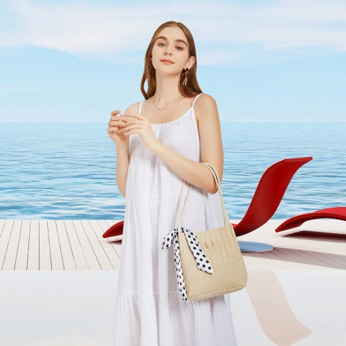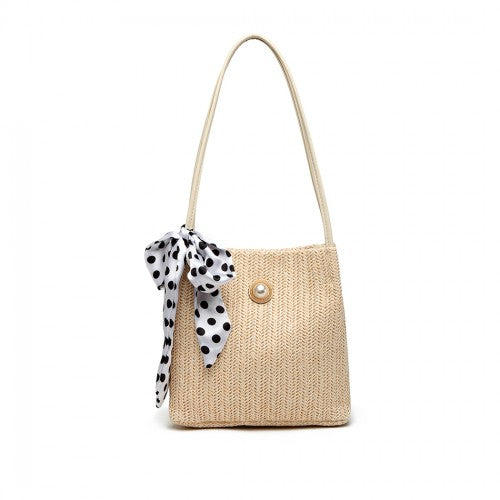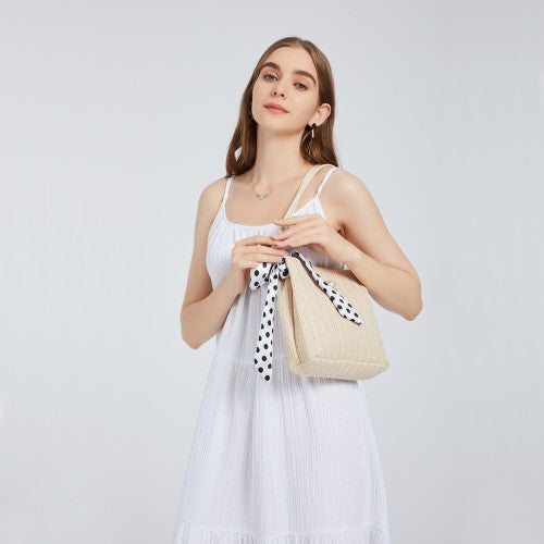 Miss Lulu Woven Straw Design Shoulder Bag With Polka Dot Scarf - Beige