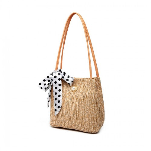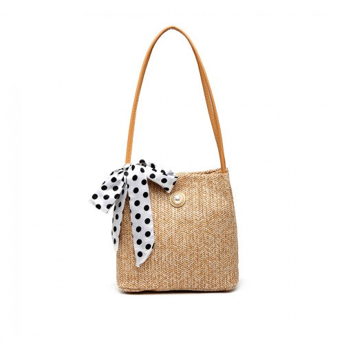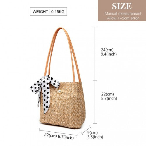 Miss Lulu Woven Straw Design Shoulder Bag With Polka Dot Scarf - Khaki